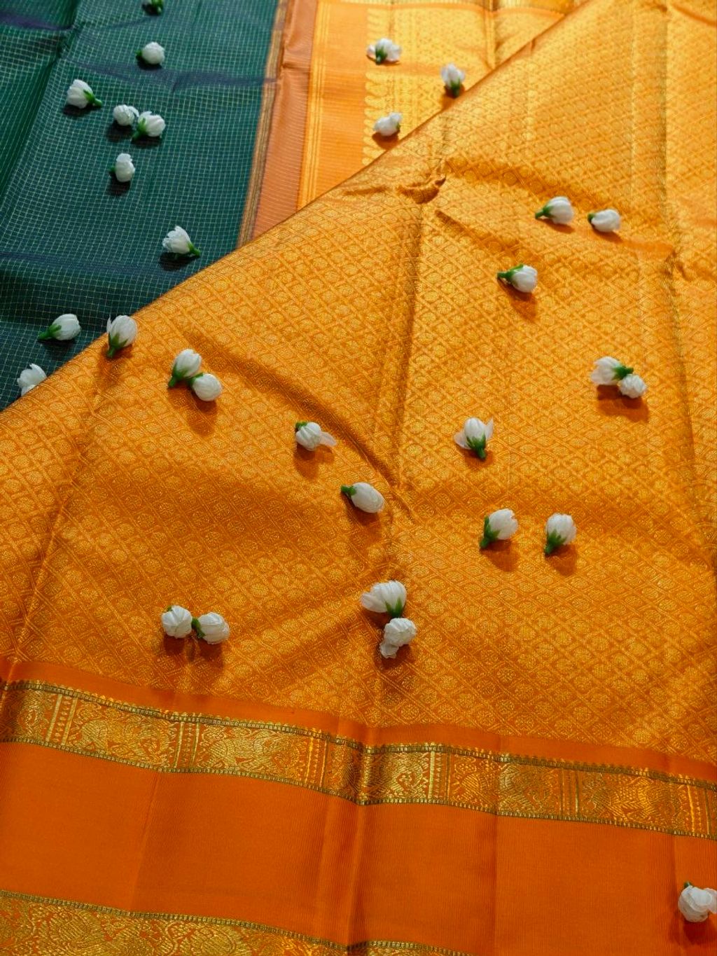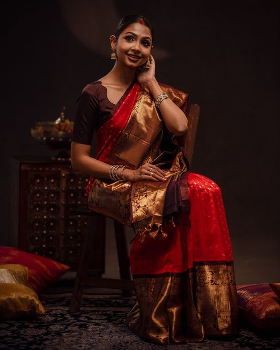 Kanjivarams often hailed as the “Queen of Silks” are premium handwoven garments celebrated for their heavy texture, vibrant contrasting colours, and intricate gold or silver zari work
